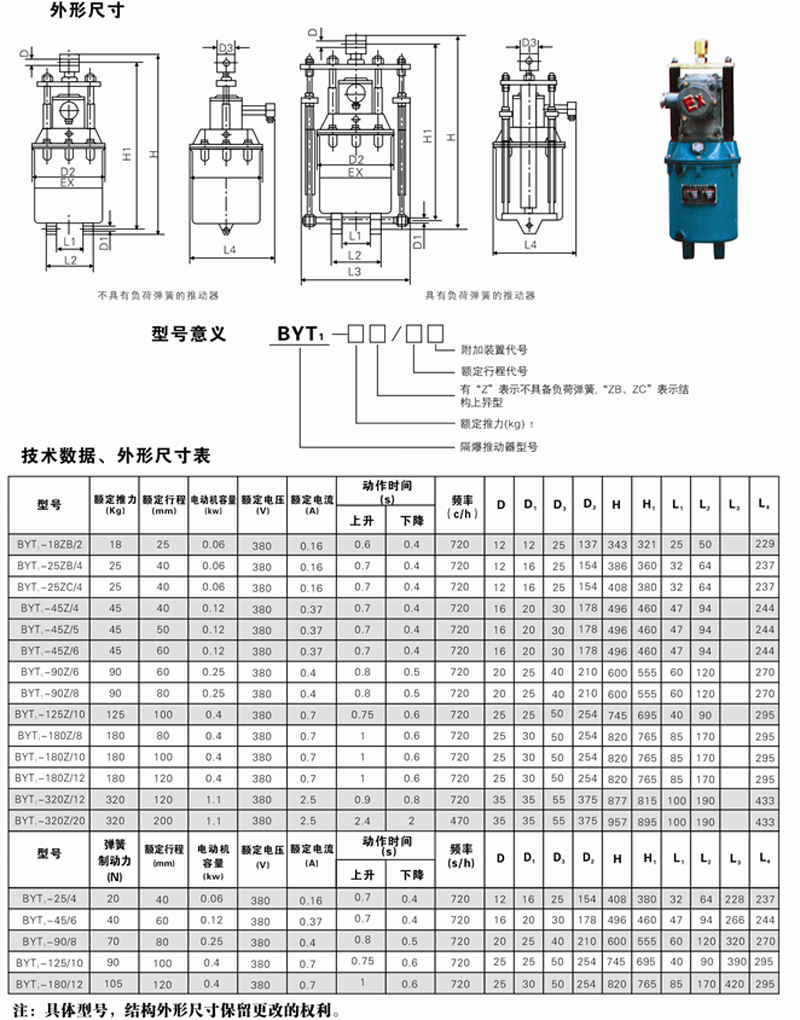 型號:BYT1-18Z/2,BYT1-25Z/4,BYT1-45Z/6,BYT1-90Z/8,BYT1-125Z/10,BYT1-180Z/12 BYT1-320Z/20 結構及動作簡介:推動器由兩部分組成,驅動電動機及器身 (離心泵),器身部分由蓋、缸、活塞、葉輪、方軸、滑道組成。 當通電時,電動機帶動轉達軸及轉軸上的葉輪旋轉,在活塞內產生壓力,在此壓力影響下 ,油由活塞上部吸到活塞下部,迫使活塞和固定在其上的推桿及橫梁迅速上升。通過杠桿機械壓縮負荷彈簧(推動器或制動器帶有負荷彈簧者),產生機械運動。(若與YWZ系列液壓推動器匹配則松閘)。 當斷電時 ,葉輪停止旋轉,活塞在負荷彈簧力及本身重力作用下,迅速成下降,迫使油重新流入活塞上部,這時仍然通過杠桿機構恢復原位。(若與YWZ系列制動器匹配則抱閘)。