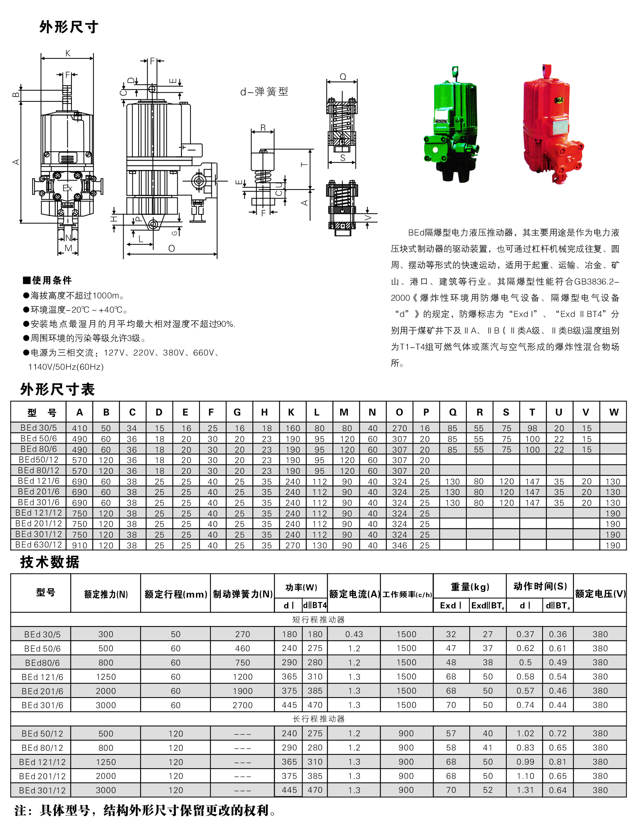 BEd防爆型電力液壓推動(dòng)器是一種集電機(jī),離心泵,油缸為一體的,結(jié)構(gòu)非常緊湊的驅(qū)動(dòng)控制裝置,被廣泛用作各種塊式制動(dòng)器和盤式制動(dòng)器的驅(qū)動(dòng)裝置,還可用于各種工業(yè)閥門,閘門,定向擺動(dòng)和轉(zhuǎn)動(dòng)(<90°)裝置(機(jī)構(gòu))及夾緊裝置的驅(qū)動(dòng)控制。